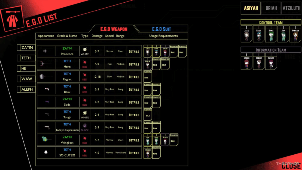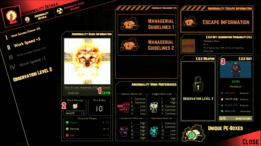 Co když abnormalita naruší izolaci? No, tady v Lobotomy Corporation nemáme zrovna velký rozpočet, takže si budete muset vystačit s různými zbraněmi a brněním ze samotných abnormalit, které zkoumáte. Za opakované dokončení práce s abnormalitami můžete odevzdávat PE-boxy, vaši měnu za každou abnormalitu, za jejich vybavení. Pokud použijeme příklad první abnormality z dřívějška, můžete mít agenta, který dokáže střílet víly, s brněním, které vypadá přesně jako ono.